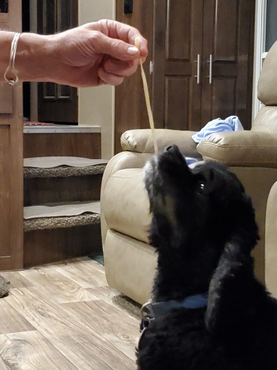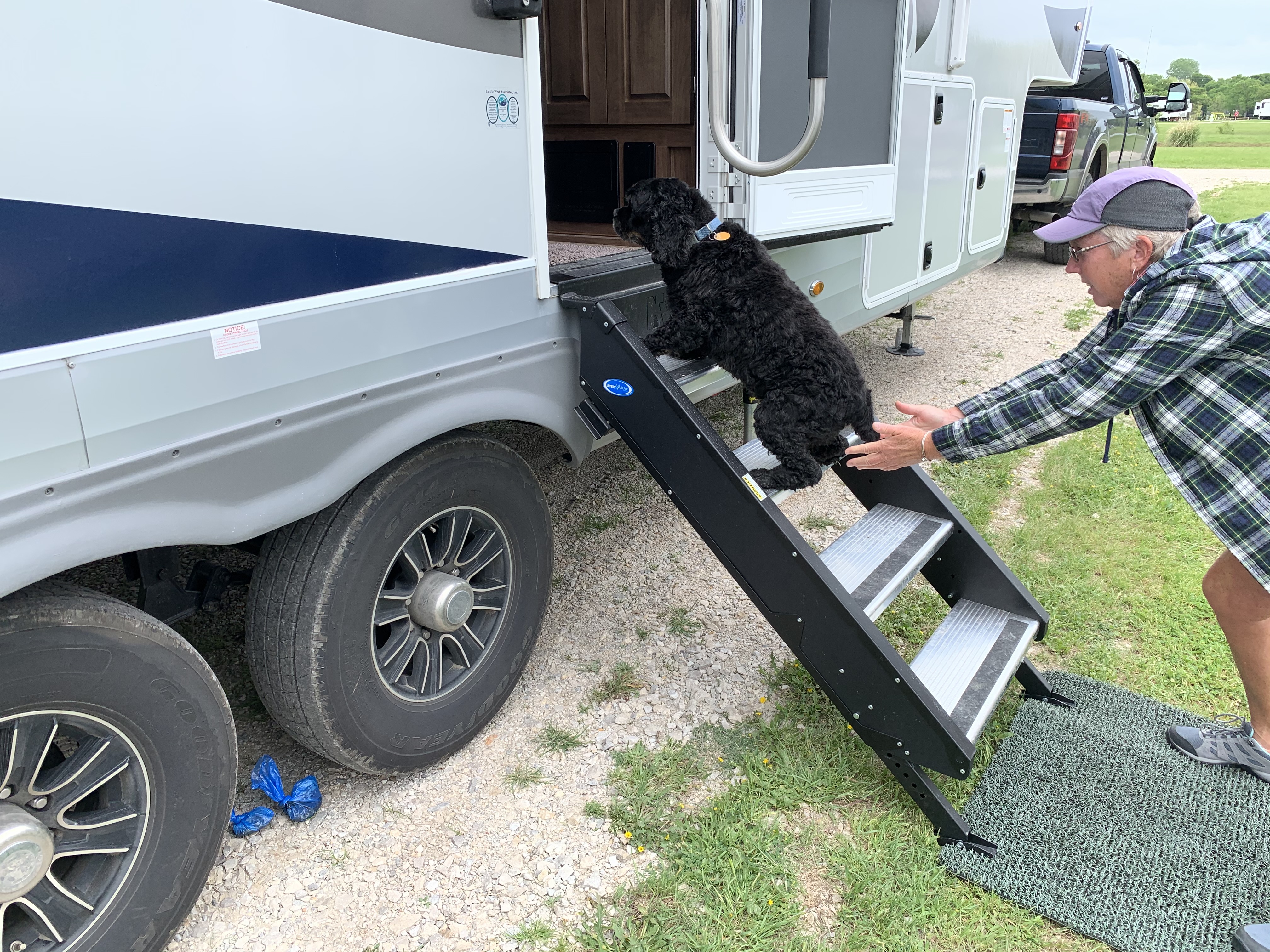 And…I buddied up to the lady next door- she loves me…just saying:-) and she has been giving me really good snacks:-) I got smart, well, I am smart, however, I figured out that when I get out of the truck and her car is at her camper, I trot right over and she appears with treats, pets and love. I am so smart, and lucky! But, then she left, gone, folded up the steps, just like that…what’s a dog to do?