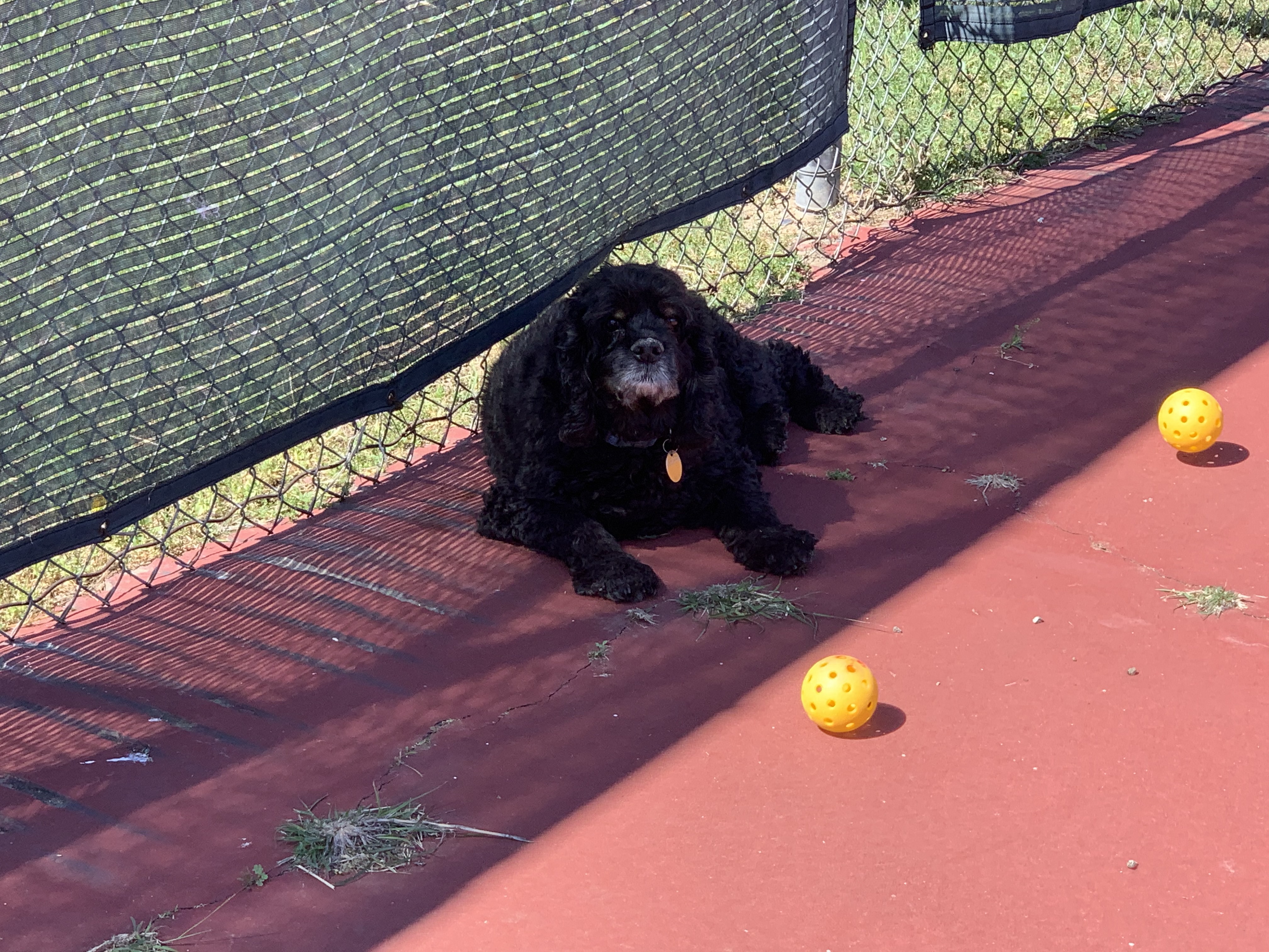My people have played a little pickleball. I go, just to keep an eye on them- as you can see, it’s not exactly exciting. And, I do NOT chase balls, nope, not me!