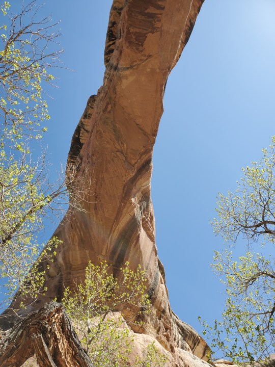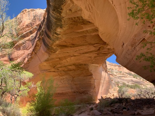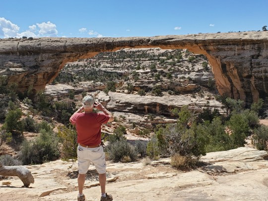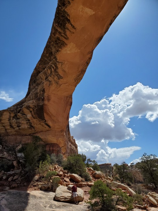 We hiked to the bottom of the canyon- three times- to stand under these bridges. Two of the hikes are strenous for sure- Sipapu drops 500 ft in .6 miles, Kachina drops 400 ft. in about .5 miles. The path is narrow, sheer drop-offs, tight switchbacks, ladders, stairs and hand rails ( you literally use them to hold yourself on the trail and pull yourself up), and we are at 6500 ft elevation. The hard work was well worth it! We were the only ones on the trail to and from Kachina Bridge, and barely saw anyone else on the other trails.