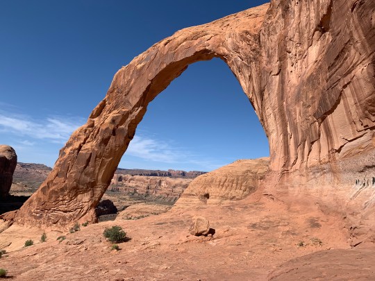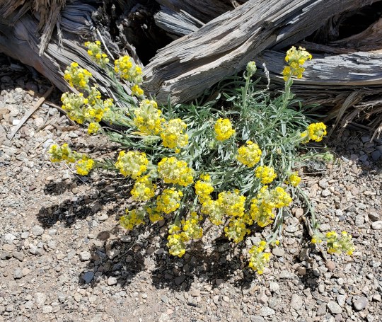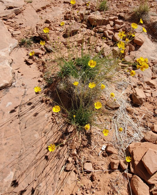 And- you can hike to many arches that are not inside the Park- so we headed to Corona Arch one morning, fairly early because the weather had turned HOT, into the 90s! Great hike-which included a cable railing on an edge, a ladder and a set of tiny steps cut into the rock and a cable to pull you up the steep rock. Awesome arch with Pinto and Bowtie along the way and tons of flowers in bloom. This area had a good rain storm about 2 weeks ago and many plants are able to bloom! Wilson Arch is beside the highway- just a short, but very steep climb to stand in it.