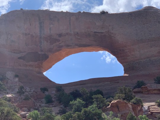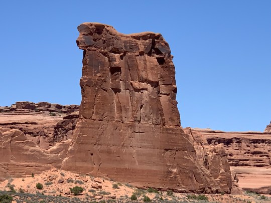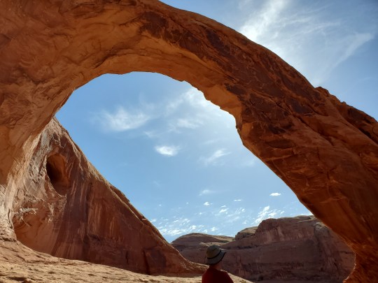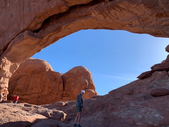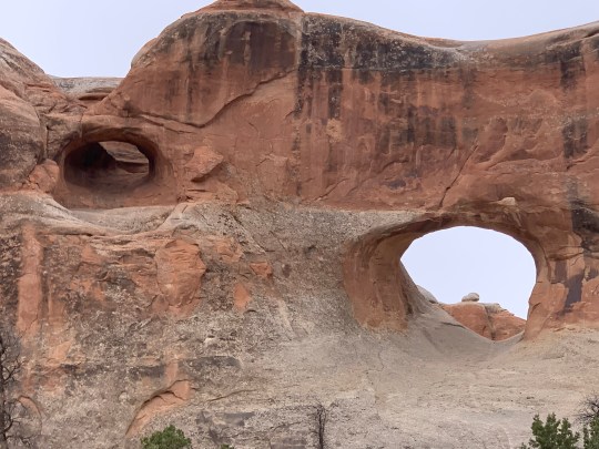 Our second day in Arches we arrive at the entrance at 7:30 and drove right in. However, every parking lot was almost full, except a few less popular ones. We hiked to Turret Arch, North and South Windows, and Double Arch. It was not too crowded here and there was a “primitive” trail to the back side of the windows with fewer people; where we founnd a tiny arch, perhaps unnamed ( an arch only has to be three feet in height, depth or width to be an arch!)