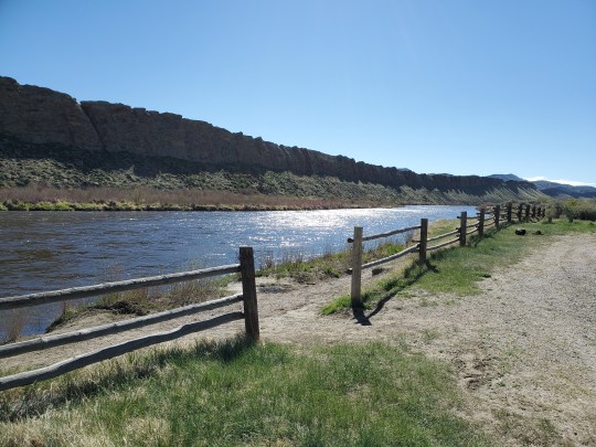 The weather had turned from 90’s in Moab to cold, windy, and….snowy! in this corner of Utah and followed us to our first stop at Green River, Wyoming where our cliff top spot was- cold, windy and snowy! Weather improved as we headed east and an overnight along the North Platte River was quiet and peaceful.